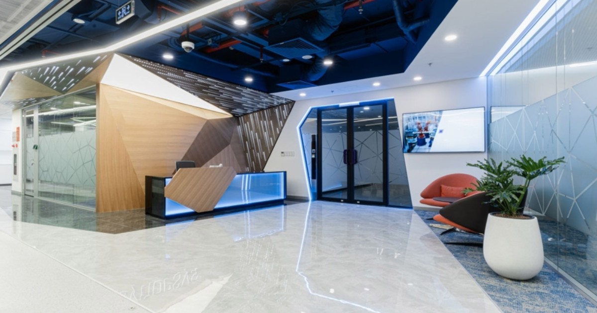 Thiết kế phá cách với mặt quầy và backdrop sử dụng tấm thạch cao cắt CNC họa tiết hình học hiện đại, đèn LED RGB ẩn bên trong có thể đổi màu theo logo thương hiệu. Mẫu cực kỳ nổi bật, thường thấy ở các công ty truyền thông, quảng cáo và studio sáng tạo.